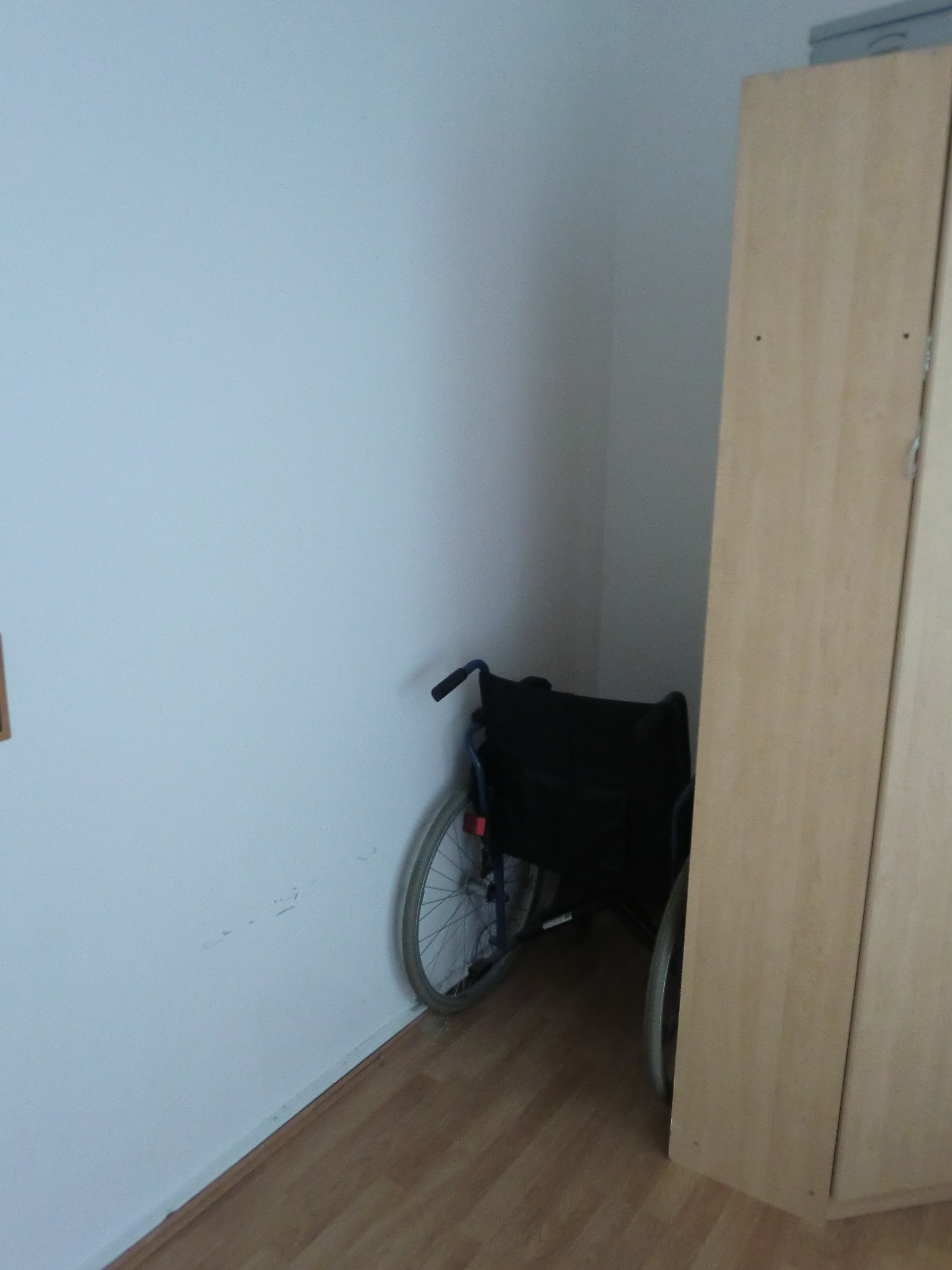 In diese Hohlstelle schieben wir dann meinen Rollstuhl mit der Silikonpuppe drin. So ist sie jederzeit leicht heraus zu holen, sie bekommt keine Schäden und sie nimmt keinen Platz in den Schränken weg. Das Loch am Ende haben wir erst einmal provisorisch verhangen, aber bald kommt eine kleine Schrankwand davor, die uns ein Freund gebraucht schenkt. Die Wand kommt auf eine Matte, damit man den Schrank leicht zur Seite schieben kann.